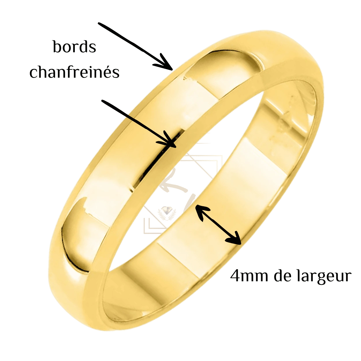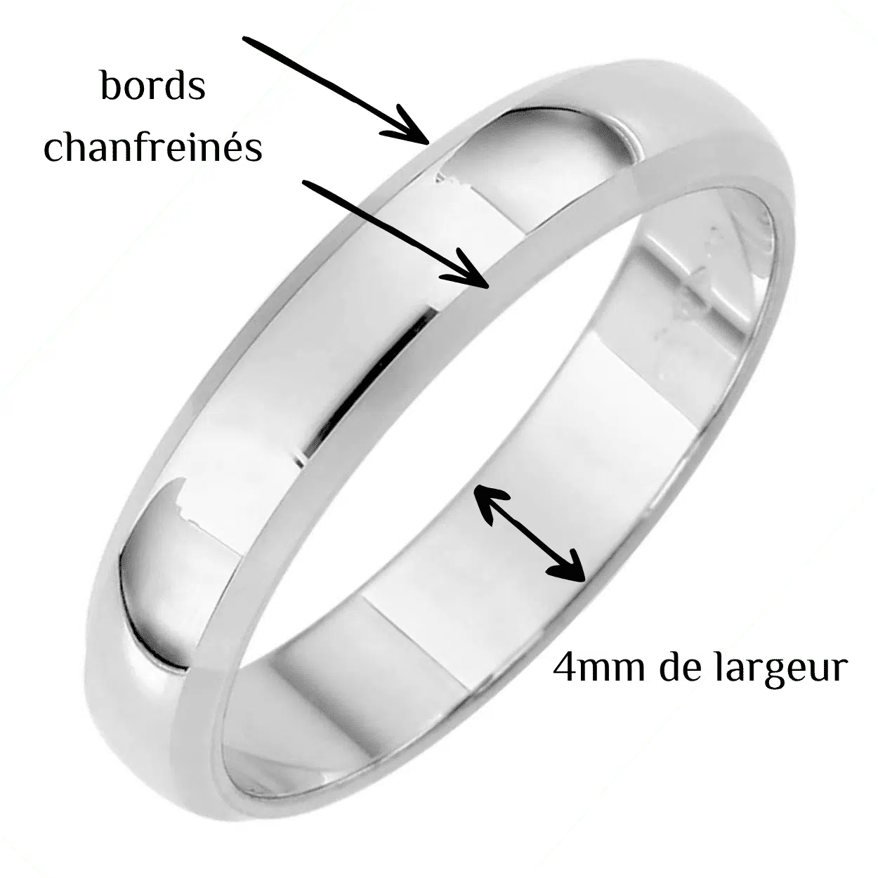 La largeur de 4 mm donne à cette alliance une présence élégante sans être trop imposante. Elle convient aussi bien aux femmes qu’aux hommes. Ses chanfreins, travaillés avec précision, créent un jeu de lumière subtil à chaque mouvement. Ainsi, le bijou attire l’œil tout en restant raffiné. L’alliance glisse facilement au doigt et reste confortable, même lors d’un port prolongé.