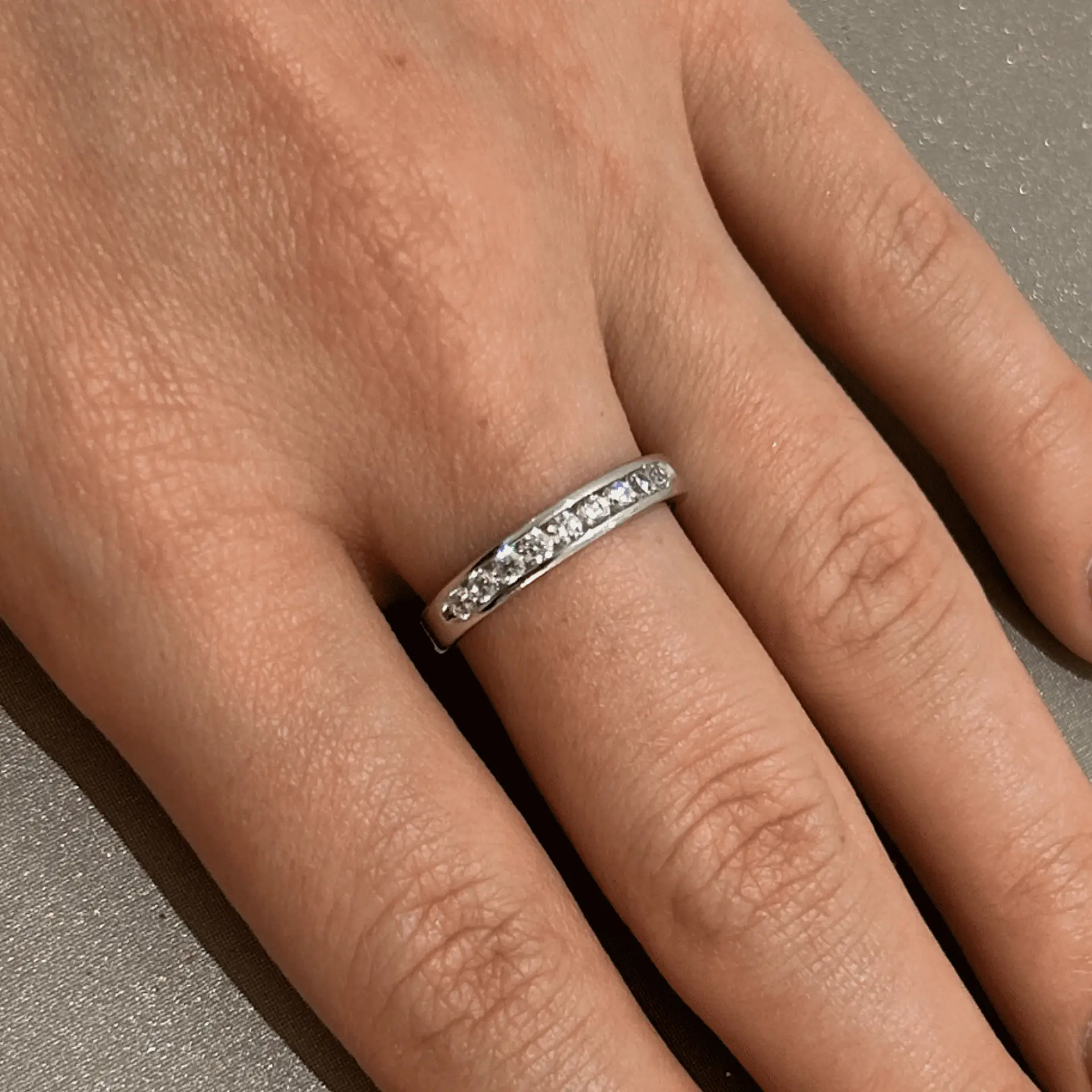 La monture en serti rail apporte non seulement une touche contemporaine, mais aussi une solidité incomparable. Elle protège chaque diamant des chocs et des rayures, tout en maintenant un profil lisse et raffiné. Avec cette technique, les diamants semblent presque flotter, créant une ligne continue d’élégance. Ce sertissage minimise également le risque d’usure, assurant que votre bague reste magnifique au fil du temps.