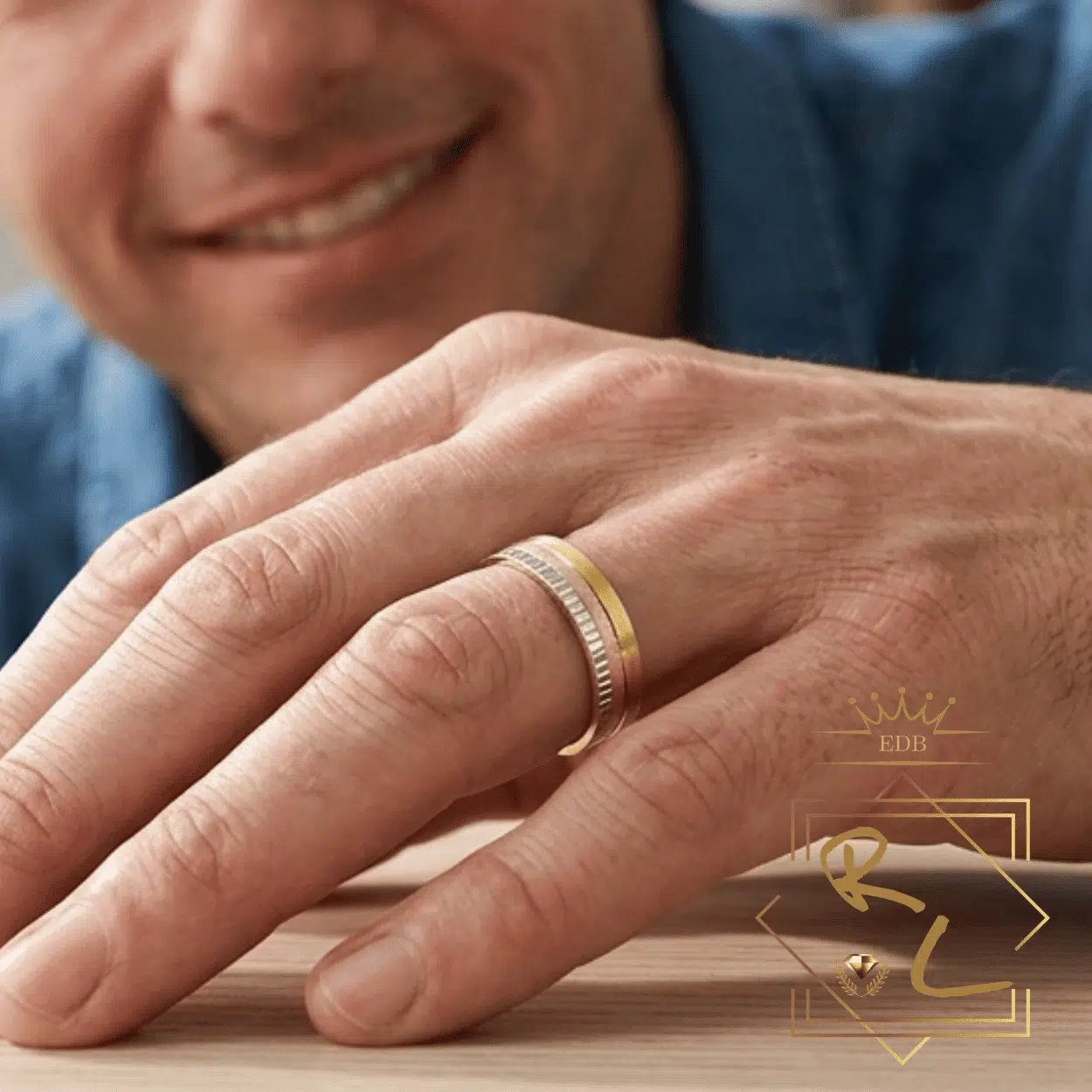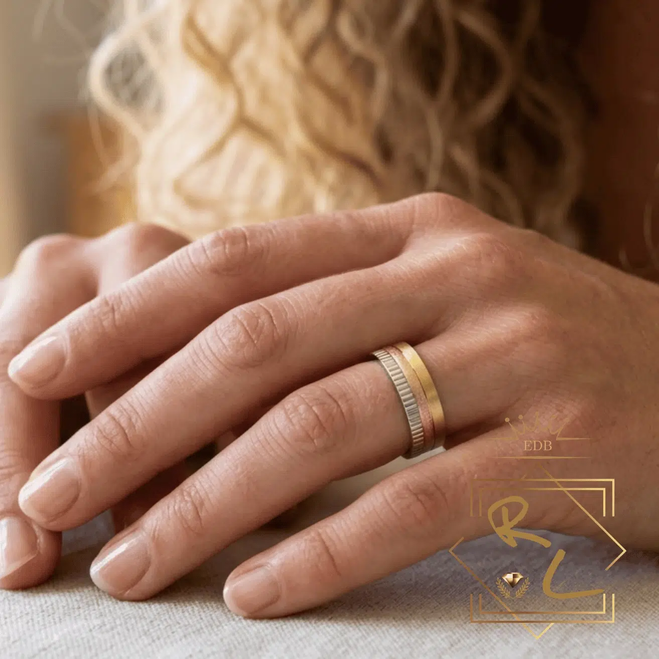 – Une alliance représentant la perfection à 3 tons, l’or jaune mat, l’or rose satiné et l’or blanc strié.