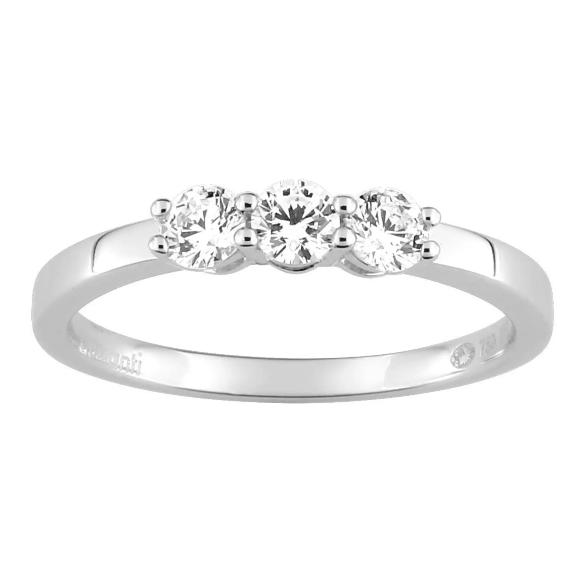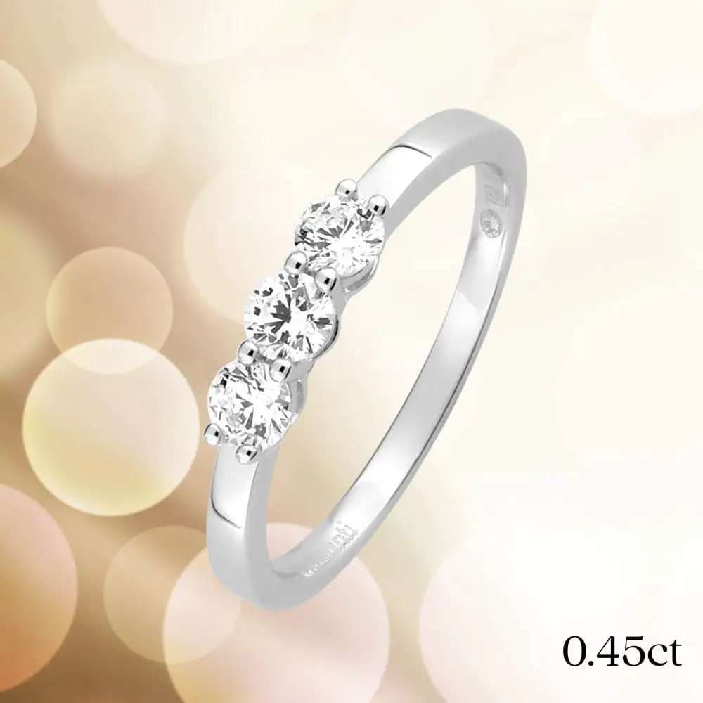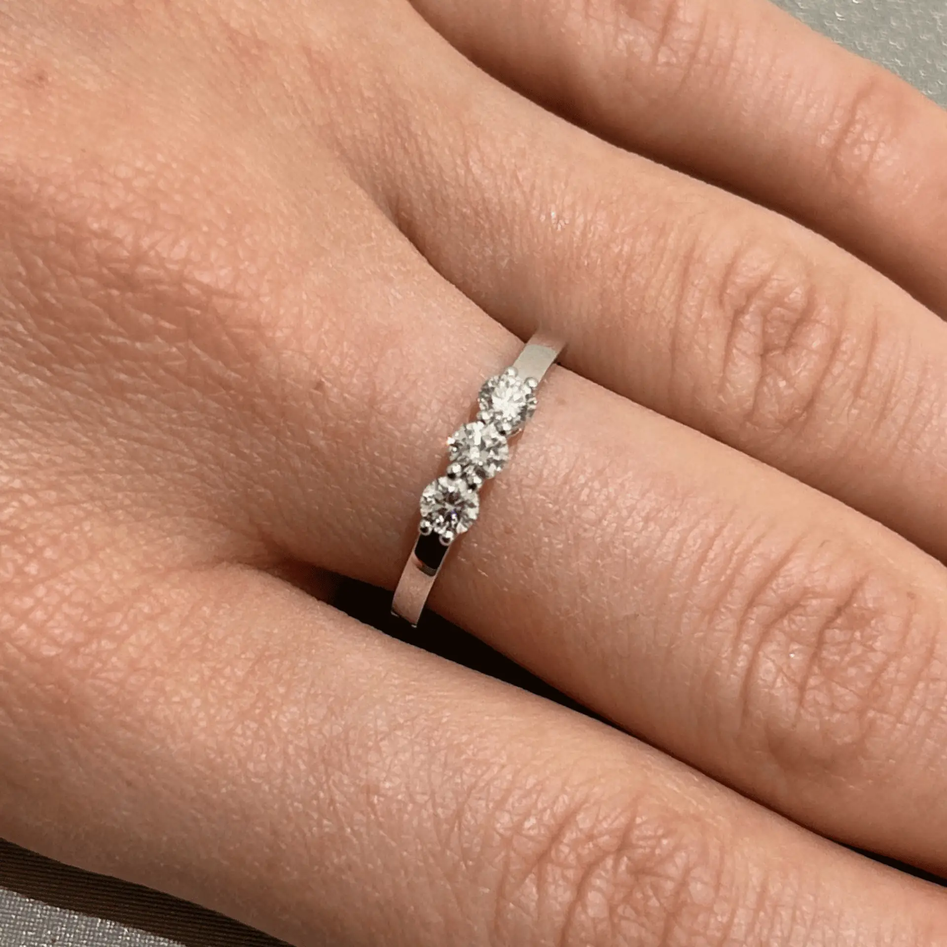 La disposition des trois pierres dans une bague trilogie crée un effet visuel harmonieux. Chaque diamant capte la lumière de manière optimale, produisant un scintillement intense. Le design symétrique met en valeur la beauté des diamants et l’élégance de l’or blanc.