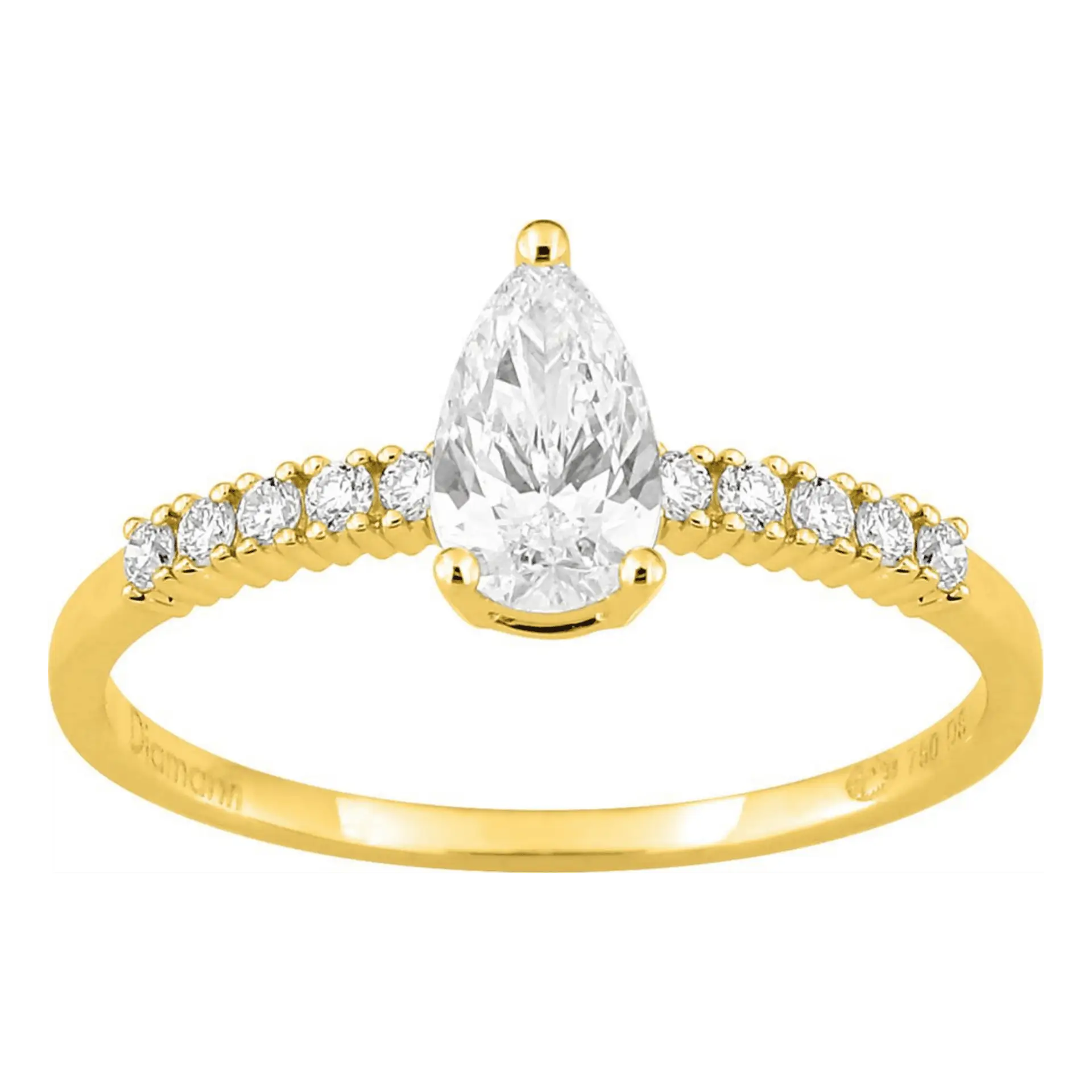 Par ailleurs, le solitaire accompagné ajoute encore plus de brillance à la bague. Les petites pierres qui entourent le diamant central, accentuent l’éclat de la bague. Ce design met particulièrement en valeur la forme poire, en accentuant sa taille et sa brillance.